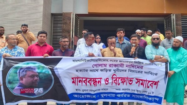 খুলনা প্রতিনিধি: খুলনায় বাংলানিউজটোয়েন্টিফোর.কমের জামালপুর ডিস্ট্রিক্ট করেসপন্ডেন্ট গোলাম রাব্বানী নাদিম হত্যার প্রতিবাদে মানববন্ধন ও বিক্ষোভ সমাবেশ অনুষ্ঠিত হয়েছে। শুক্রবার (১৬ জুন) বেলা ১১ টায় খুলনা প্রেসক্লাবের সামনে খুলনায় কর্মরত সাংবাদিকদের