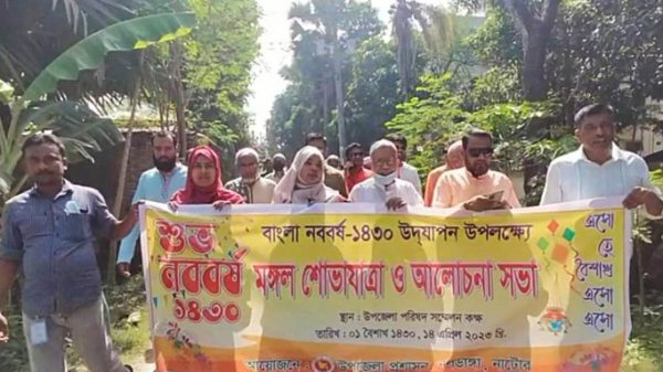 শামীম পারভেজ, (নাটোর) প্রতিনিধি :: মঙ্গলশোভাযাত্রা ও আলোচনা সভার মধ্য দিয়ে নাটোরের নলডাঙ্গায় বাংলা নববর্ষ পহেলা বৈশাখ উদযাপন করে উপজেলা প্রশাসন। শুক্রবার বেলা ১০ টার দিকে উপজেলা প্রশাসনের আয়োজনে ইউএনও